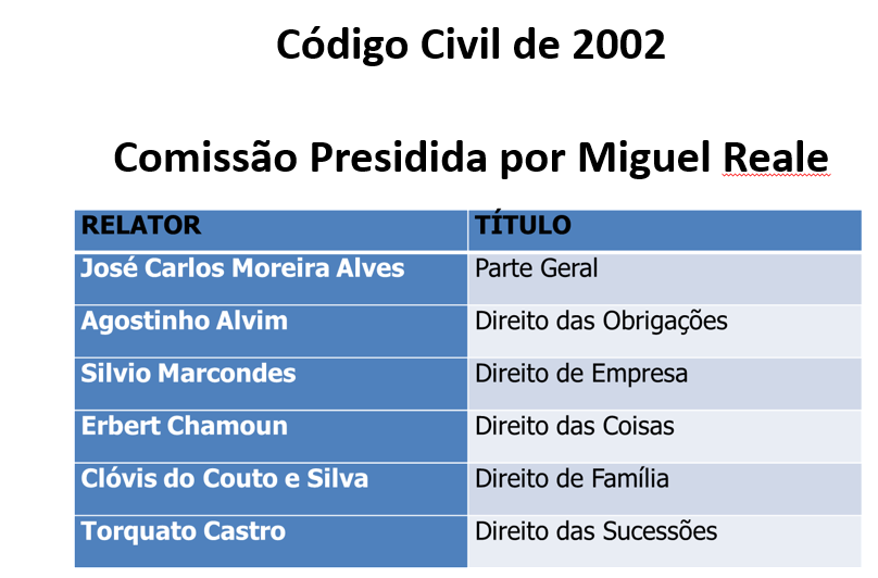 Após décadas de tramitação – e esquecimento – veio o Código Civil de 2002, advindo de anteprojeto com a seguinte equipe de juristas: