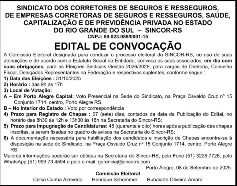 O Sindicato dos Corretores de Seguros do Rio Grande do Sul (Sincor-RS) tornou público nesta quarta-feira, 10 de setembro, no jornal Correio do Povo (página 8), o edital de convocação para as eleições sindicais da gestão 2026/2029.