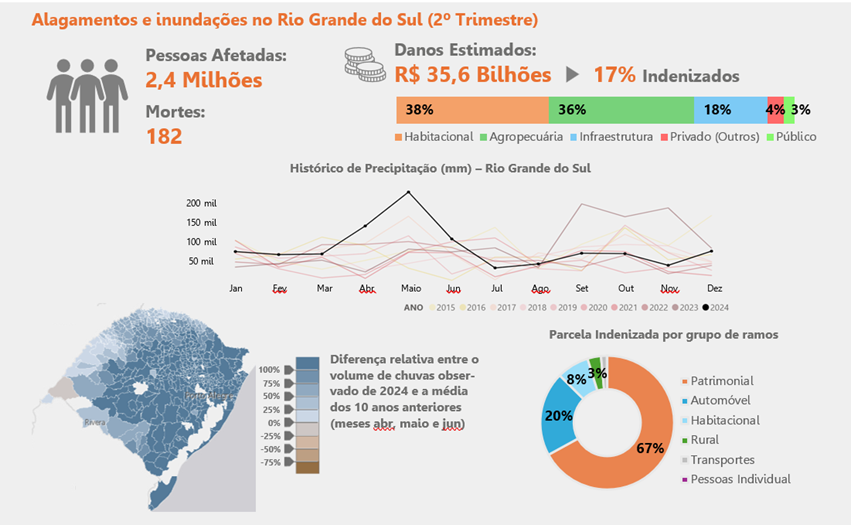 O caso mais emblemático ocorreu em 2024, no Rio Grande do Sul, quando o país registrou o desastre climático mais severo de sua história: 2,4 milhões de pessoas afetadas, 182 mortes e R$ 35,6 bilhões em perdas diretas..